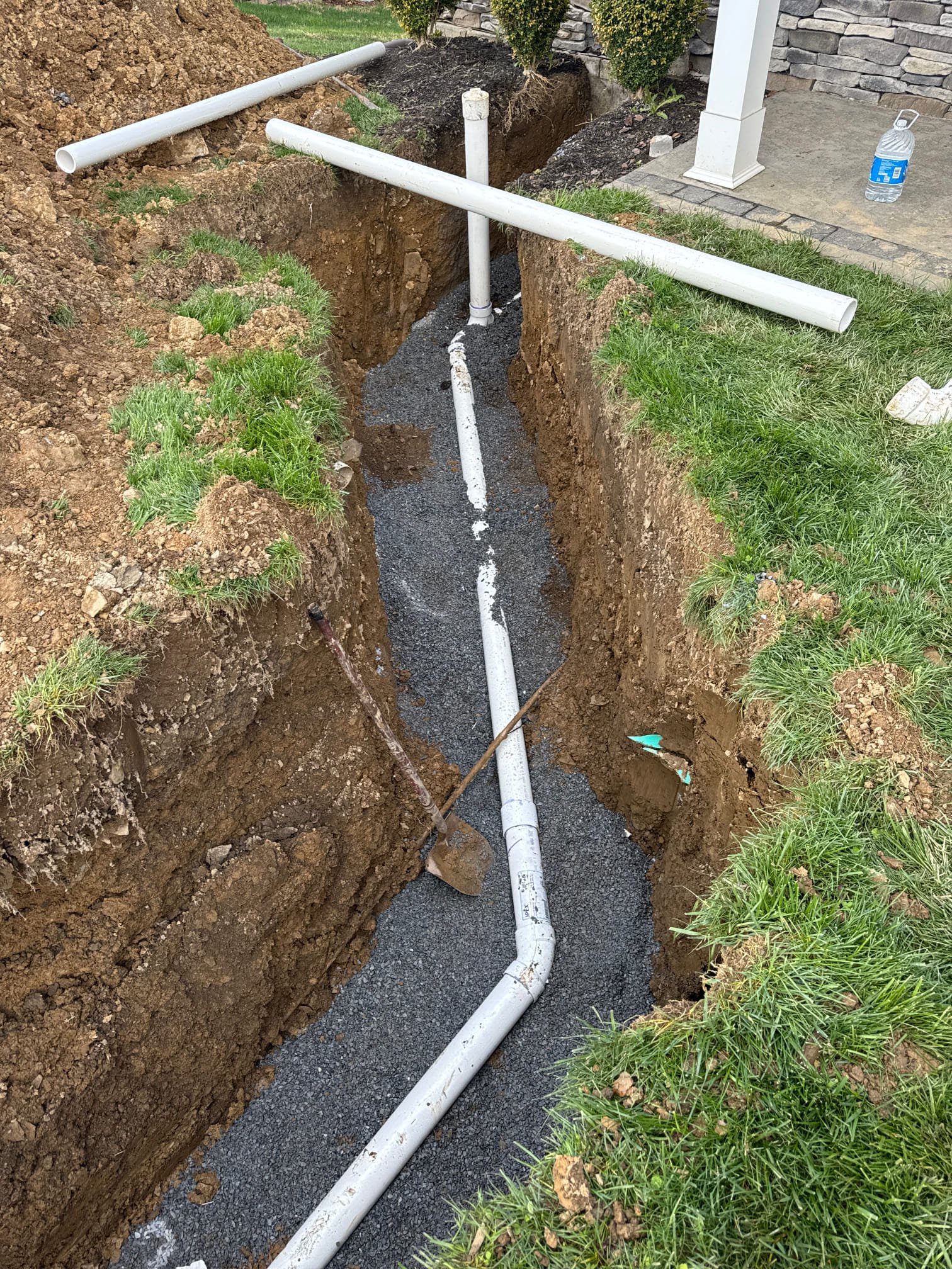 Handyside Plumbing, HVAC & Electrical resolved the issue by completing a full sewer line replacement and repair despite the lateral being at a significant depth, which required larger equipment. We pulled the necessary permits and coordinated PA One Call, then excavated and trenched from the home to the curb to access the damaged clay line. After safely exposing the pipe, we removed the failing section, bedded the trench with stone for stability, and installed new 4" PVC piping with two new cleanouts (one at the home and one at the curb) for easier future service. We also lined the section from the curb to the street, tested the system to confirm proper operation, and coordinated the township inspection. Once approved, we backfilled and restored the area, including replacing the concrete sidewalk.