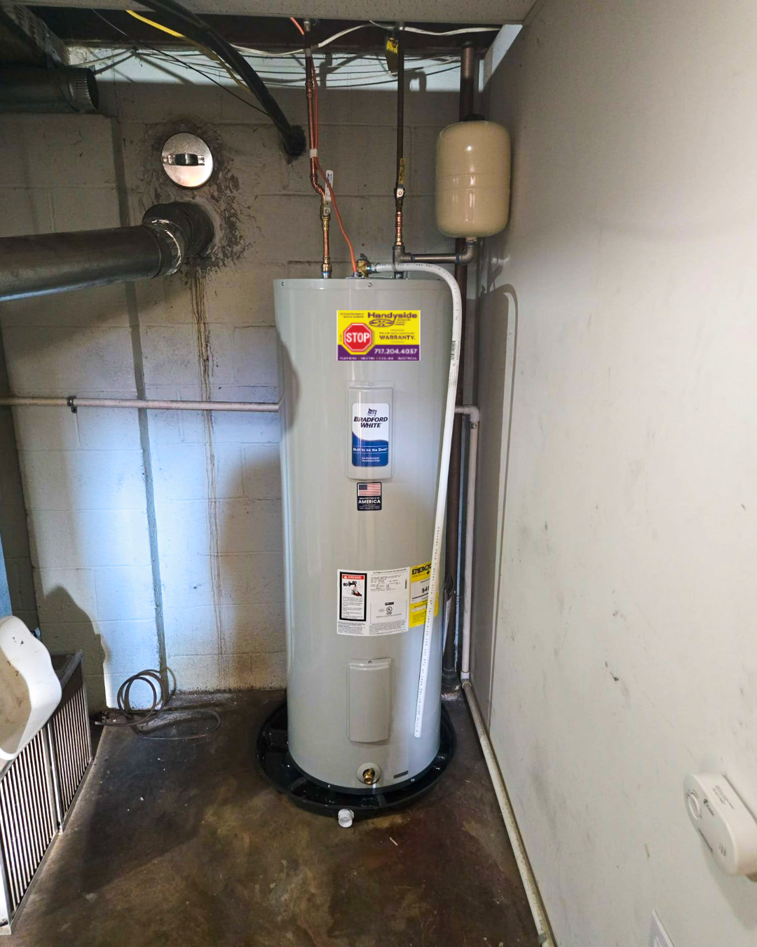 Handyside Plumbing, HVAC & Electrical provided removal of the existing oil fired water heater and installation of a new electric water heater for the customer, beginning with a full inspection of the existing system and proper preparation of the work area to safely disconnect and remove the aging tank. Our team then disconnected the oil supply and associated piping, removed the deteriorating water heater, and installed the new electric unit with updated water connections and required electrical components to support safe and reliable operation. After installation, we filled and tested the system to confirm proper performance, checked for leaks, verified electrical operation and temperature settings, and reviewed the completed work with the homeowner to ensure they understood the new system and to support reliable hot water service going forward.